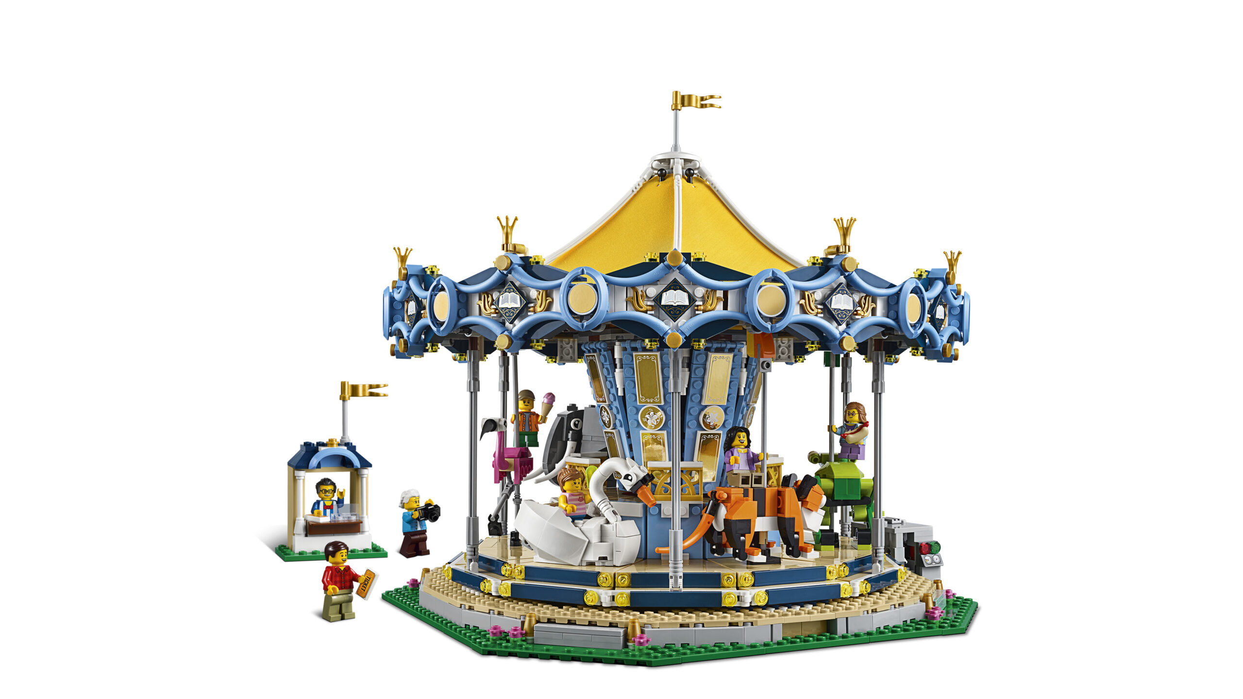 Fai un giro sulla maestosa Giostra, ricca di fantastici dettagli, tra cui un grande baldacchino tessile con decorazioni ornate riflettenti blu e oro, pannelli centrali riflettenti, doppia piattaforma con “stazione” di imbarco rialzata e corrimano e piattaforma principale con cinque animali costruibili, tra cui un cigno bianco e quattro altri animali mobili. Gira la manovella e osserva l’elefante, la tigre, il fenicottero e la rana muoversi su e giù mentre la giostra ruota. Questo fantastico modello LEGO® Creator Expert trasuda un’iconica eleganza che evoca sentimenti di nostalgia, romanticismo e avventura. Dotalo delle LEGO Power Functions per un funzionamento completamente motorizzato. Include sette minifigure.